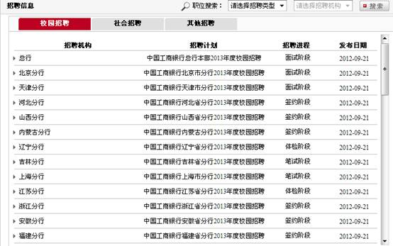 工商銀行在這幾年都在其官方招聘平臺進(jìn)行招聘,旗下所有機(jī)構(gòu)的招聘流程都需要按照規(guī)定的流程進(jìn)行,并在站點(diǎn)上公示每一個(gè)階段,相對來說比較透明。